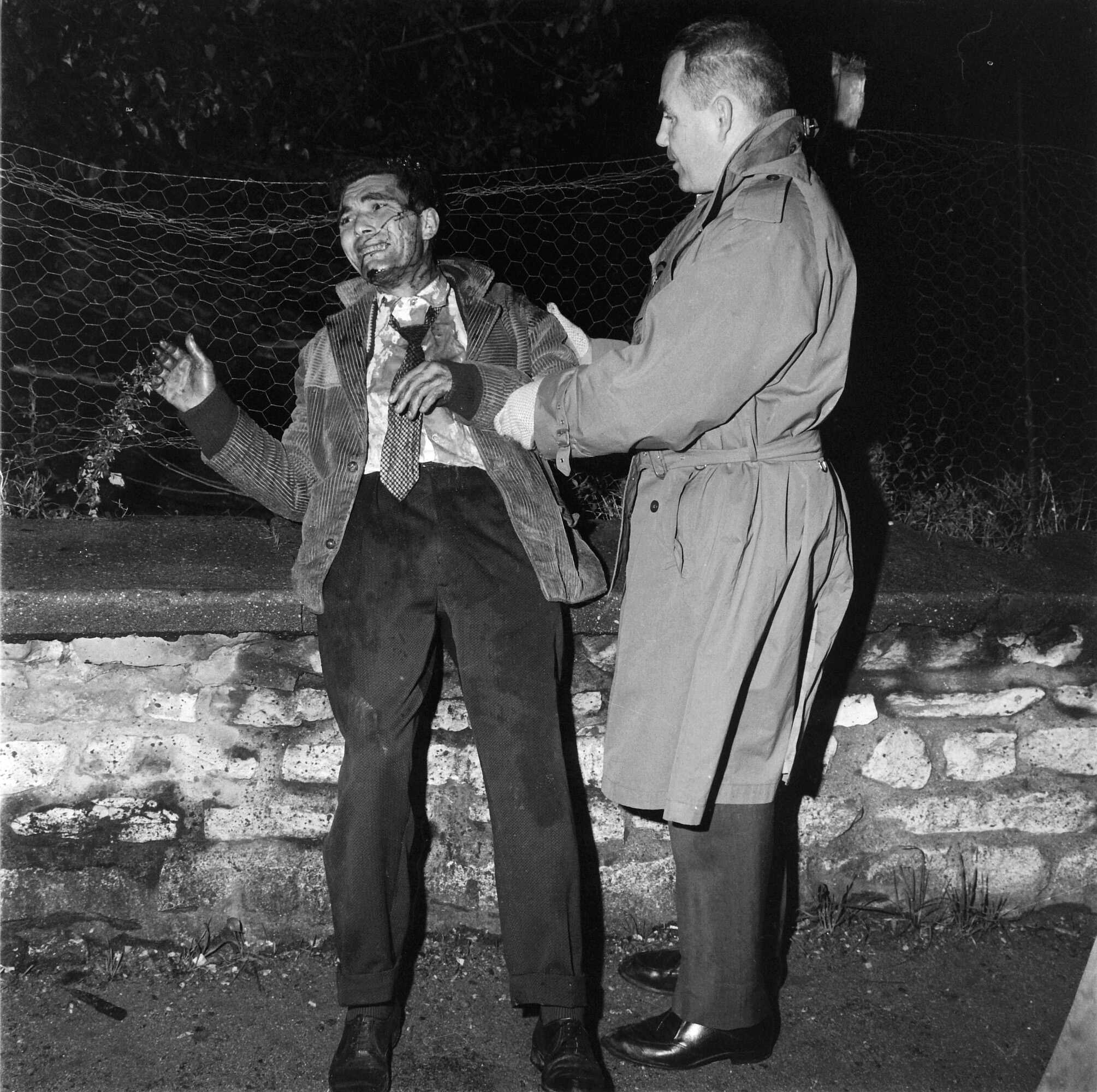 Homme blessé adossé à un grillage rue des pâquerettes, un policier debout prêt à l'arrêter, Elie Kagan, 17 octobre 1961
